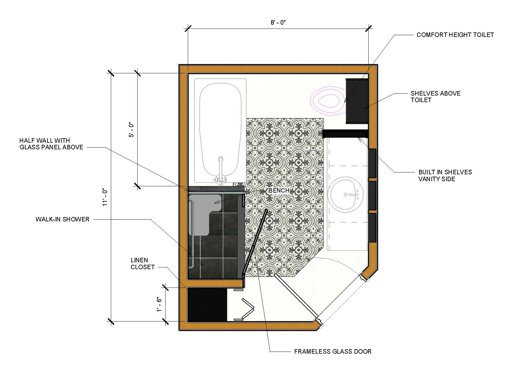 Description: The Hattons hired Jason K. Adamski General Contracting to remodel their Bathroom. After conversing with the clients and understanding what their lifestyle requires, I was able to design and render several iterations of the project, which were revised and edited to fit the client's desires. Once finalized, the drawings were submitted for review and approval for permits.