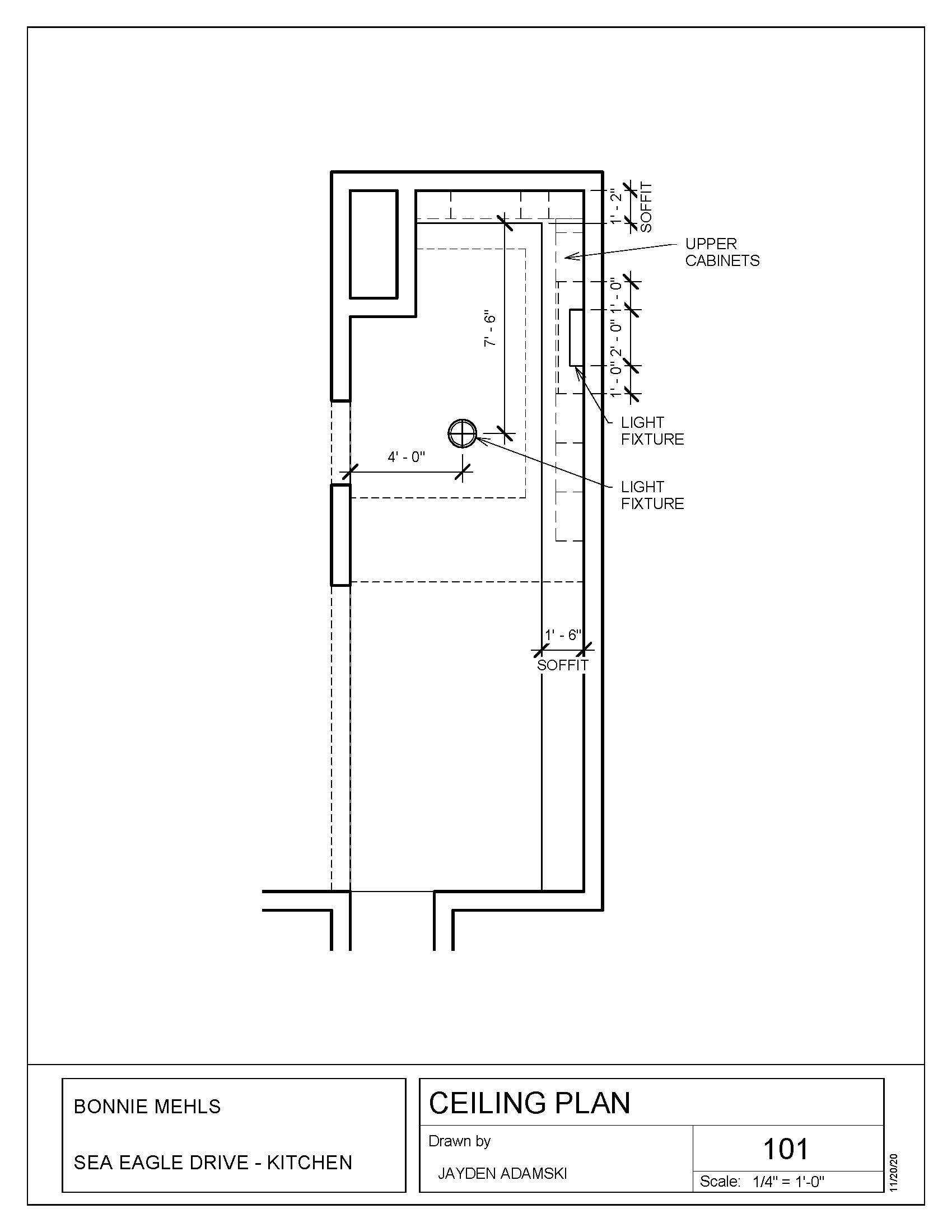Bonnie Mehls hired me to produce drawings for permitting and design purposes at her condo in Delaware. She asked for specific measurements, a power plan, a ceiling plan, and several other diagrams. In order to provide her the most accurate drawings, I took a trip to the residence and was able to measure and document the space as requested. The drawings were later used for permitting and a light remodel.