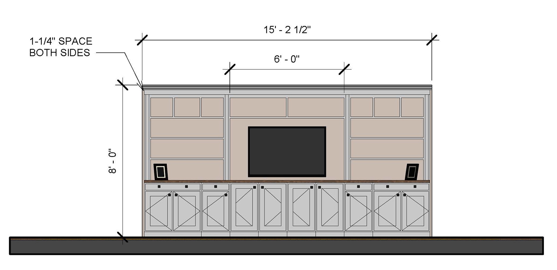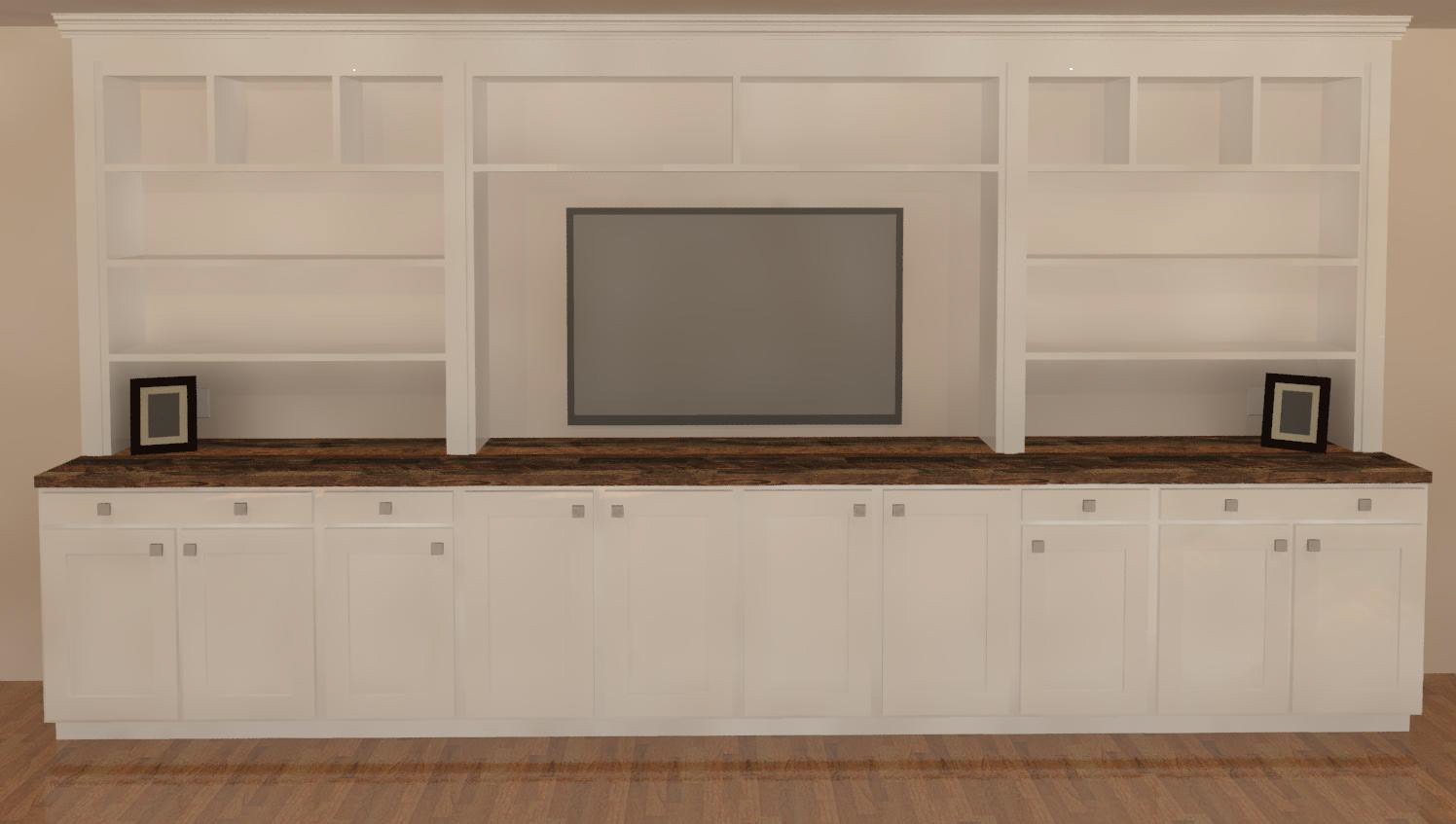 The Griffins hired Jason K. Adamski General Contracting to help them come up with a custom solution for their entertainment center in their living room. In order to provide them many options, I created renderings and elevations of different style shelving. There were several modificatons until they decided they really liked one of the options. Once the family was satisfied with the idea, Jason and his crew custom built the cabinetry and installed it.