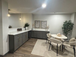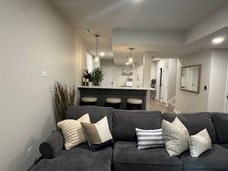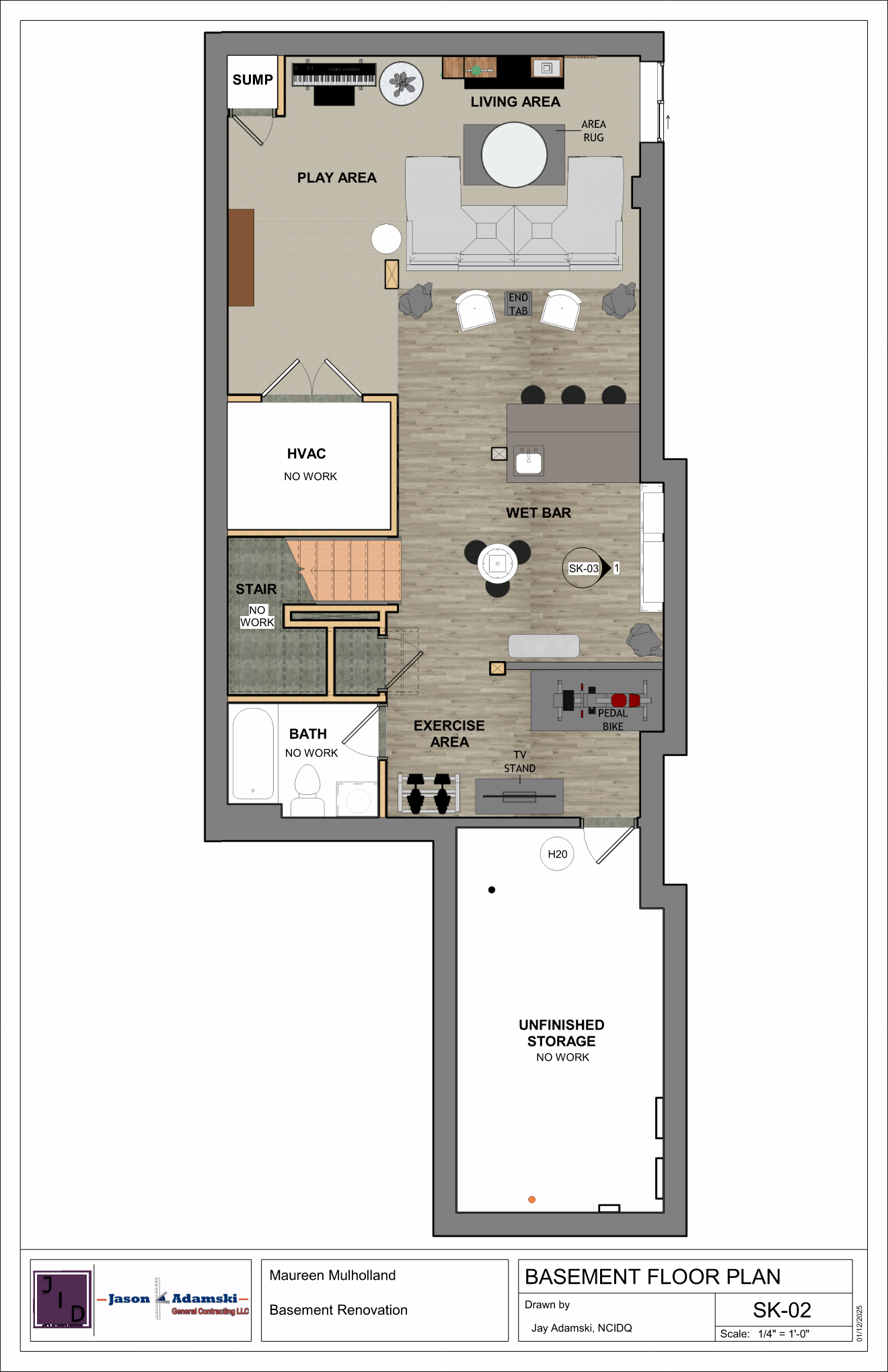 Description: Maureen M. hired Jay's Interior Designs & Jason K. Adamski General Contracting to help redesign & remodel their basement, turning a clunky would-be living space into a cohesive and functional hangout with a wet bar & a cozy atmosphere. Initially, the client was unsure how to use the area to their advantage, with structural columns posing a big challenge, impeding the center of the space. Through design meetings and careful guidance, we were able to find a functional arrangement that allows the client to use the space every day while also welcoming guests and hosting. This project was completed in 2025.