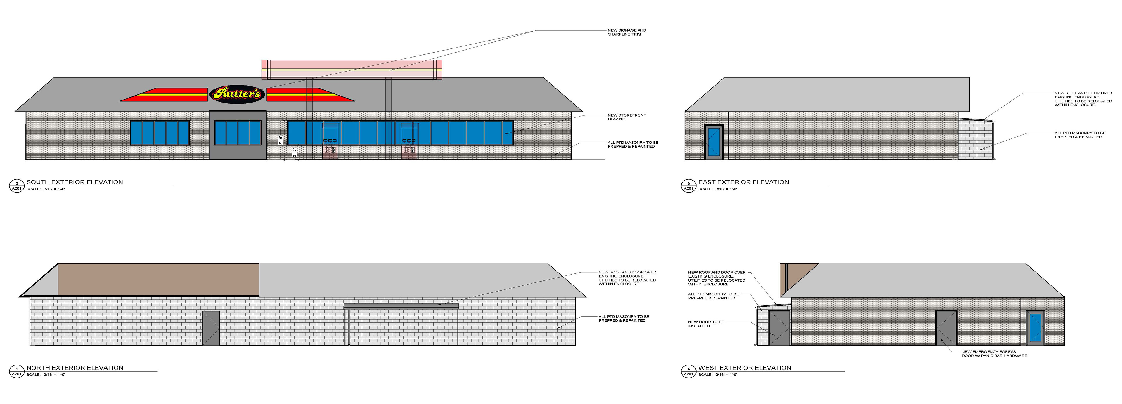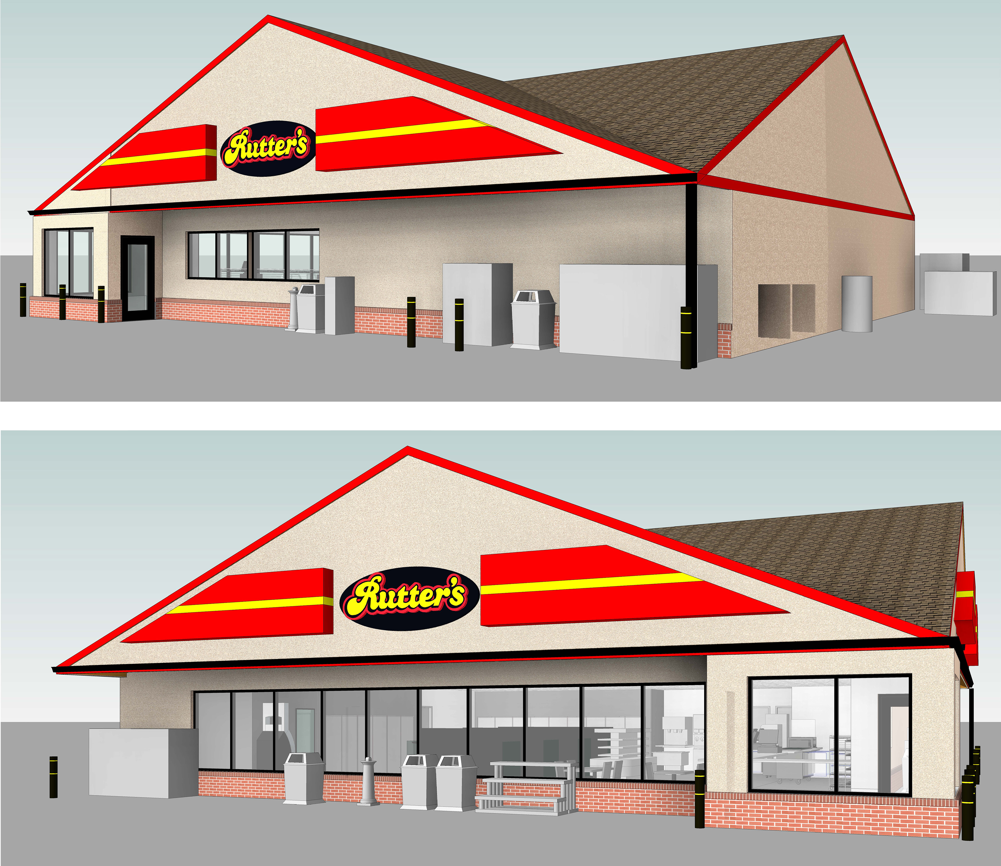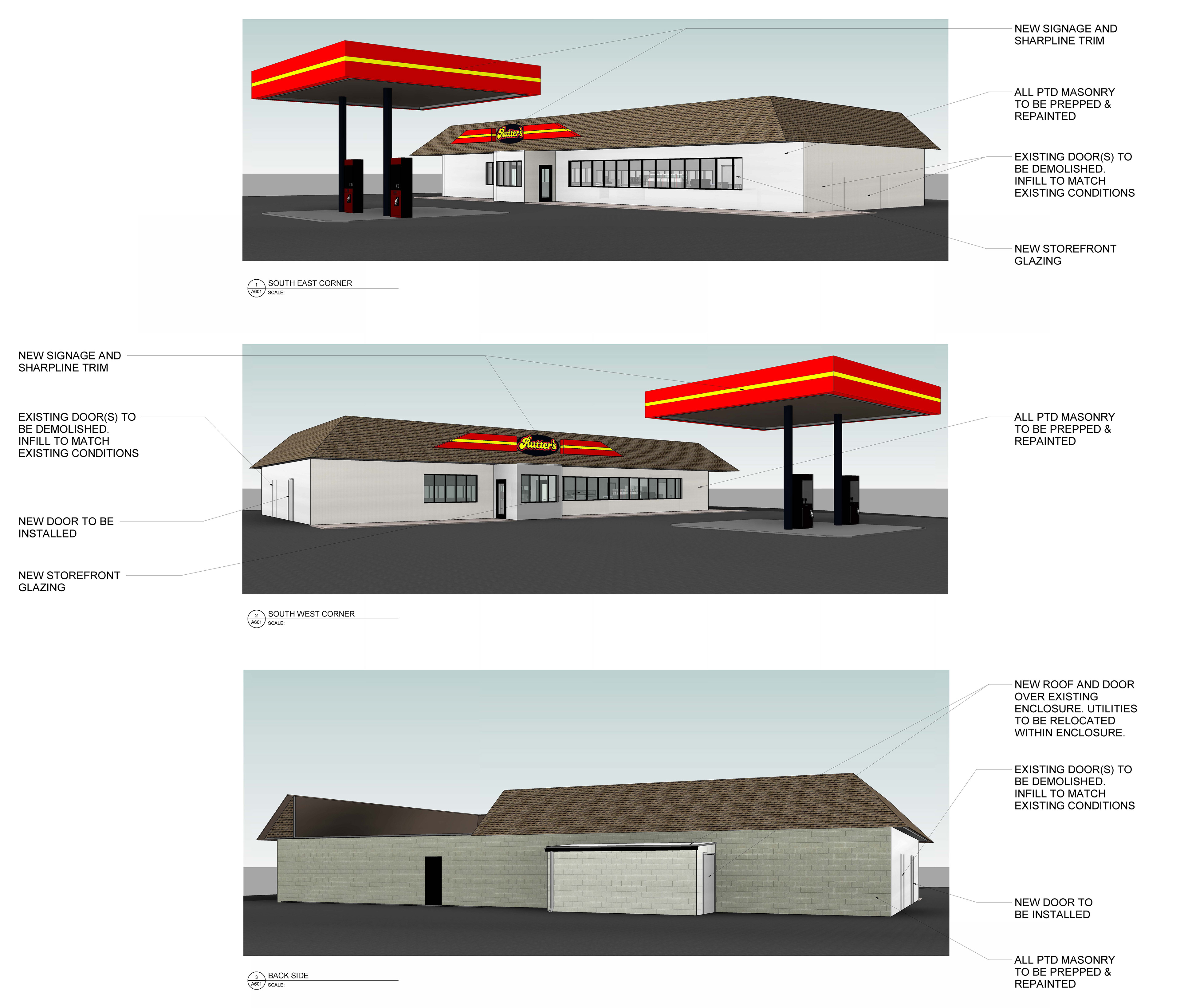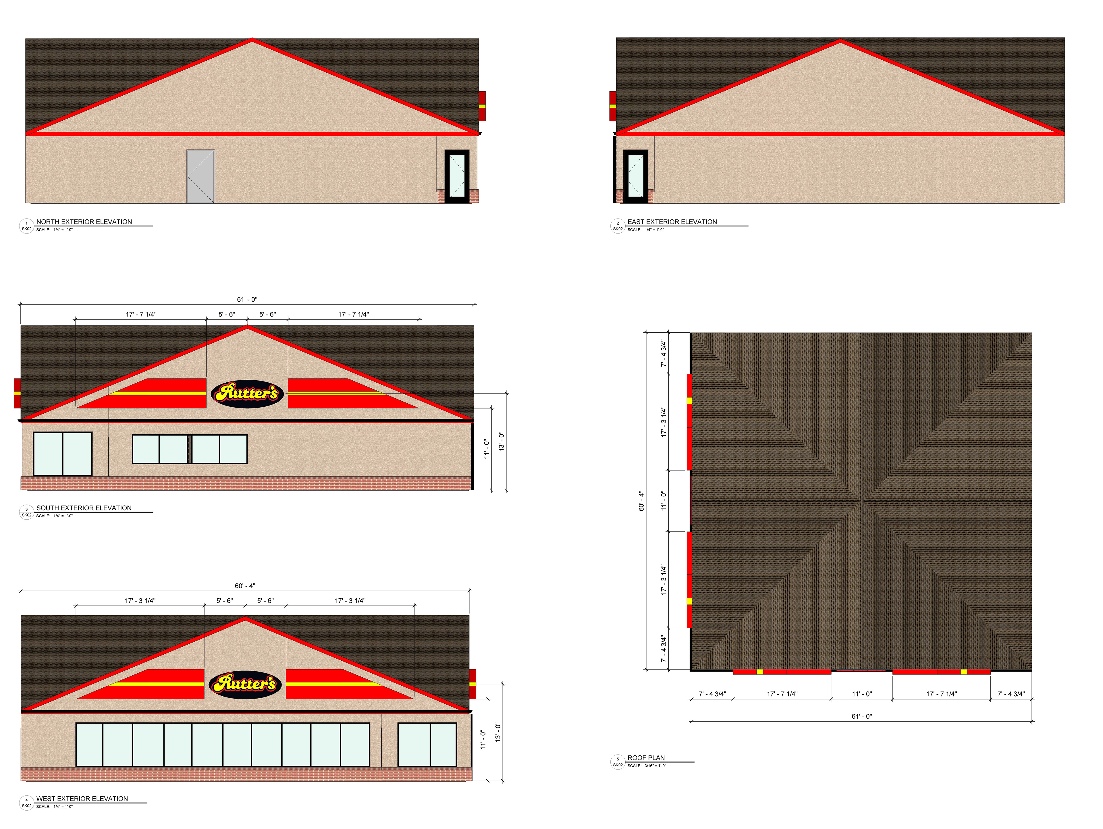 Rutter's #21 in Manchester, PA is currently being redesigned in 2021. In order to provide details to our consultants at Sharpline Converting Inc., exterior renderings, elevations, and a roof plan were created and provided for estimating.