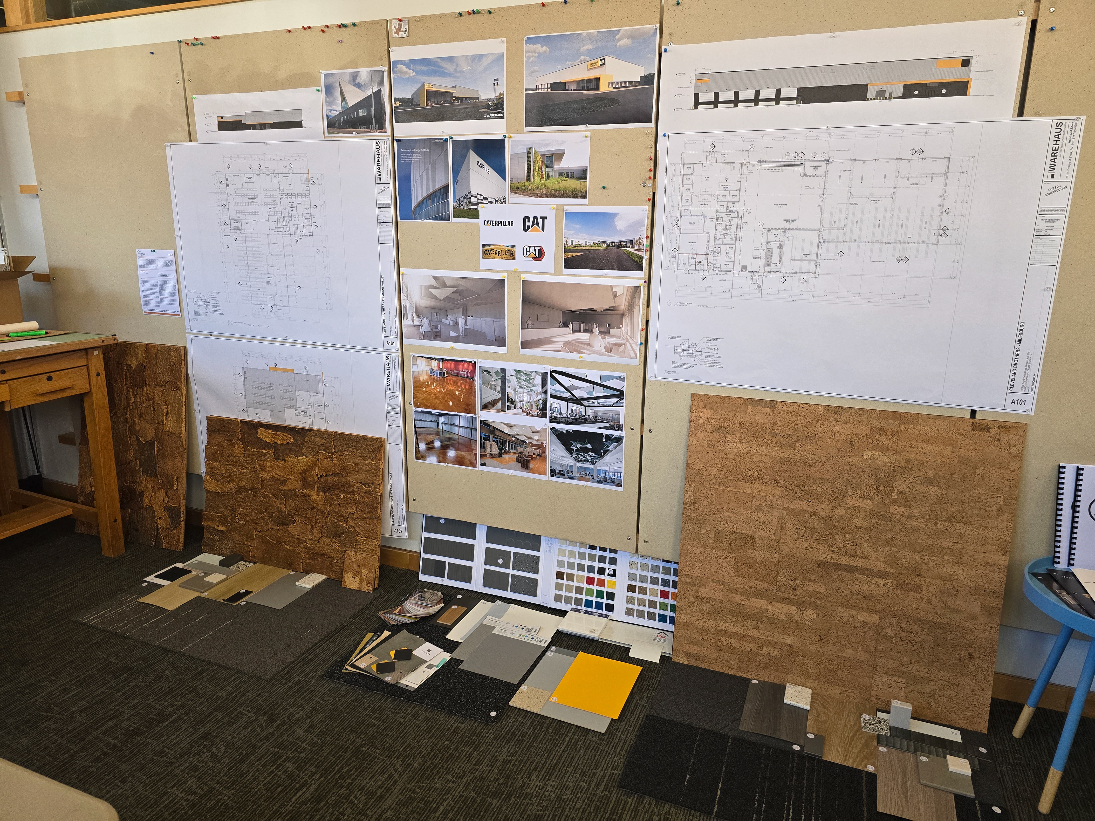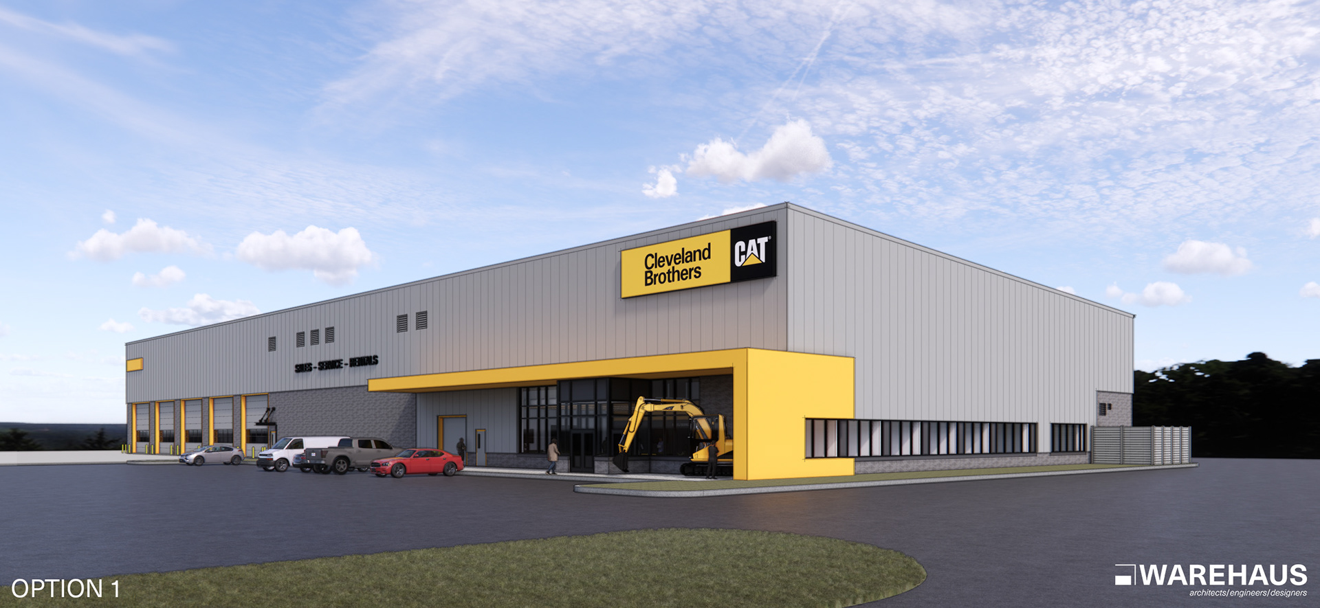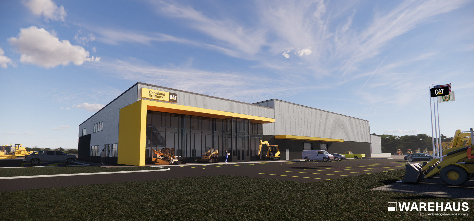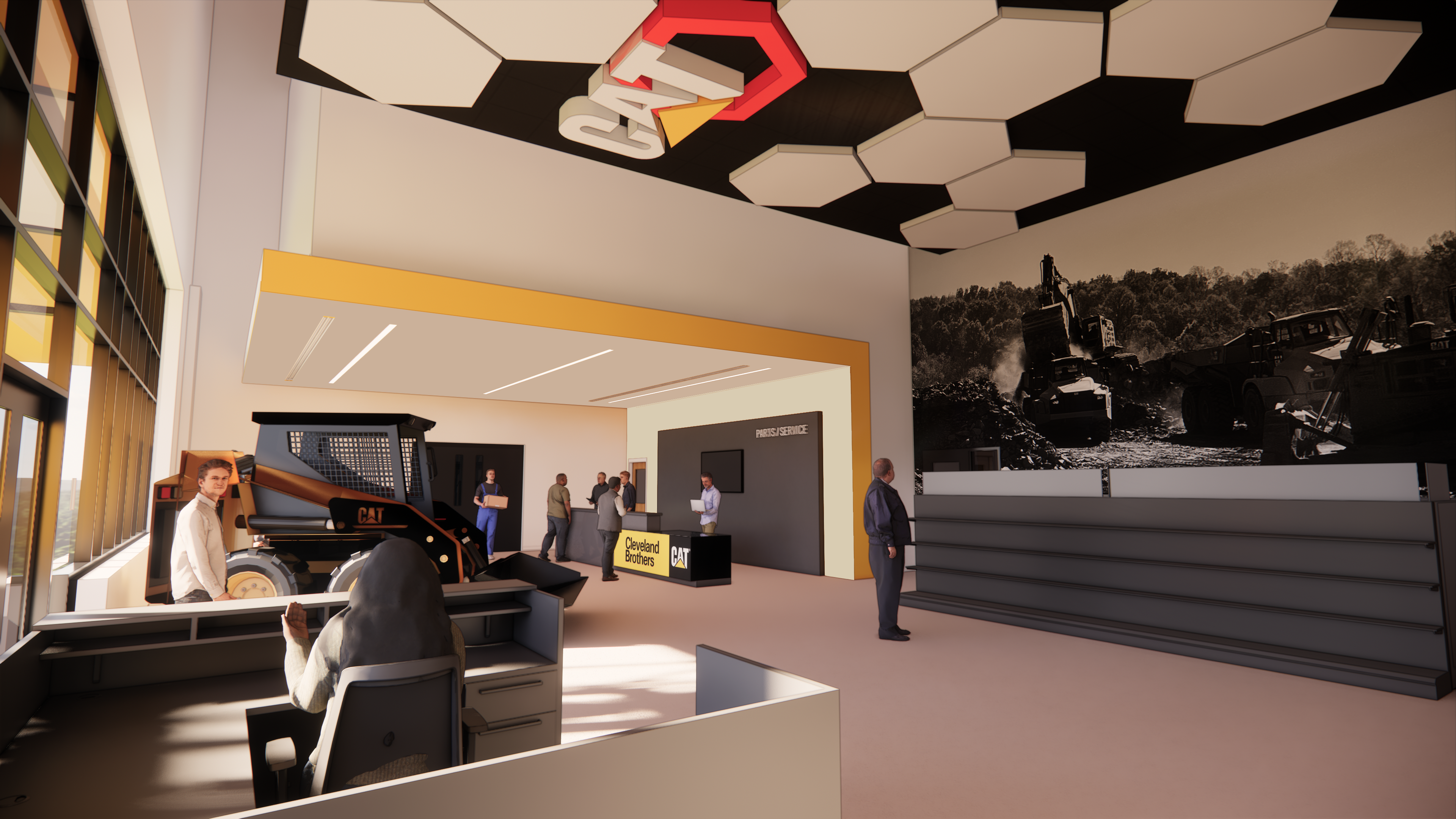 Cleveland Brothers Facilities sells large equipment like CAT-brand excavators and tractors. When their plans included 3 new facilities to be designed and constructed, they turned to Warehaus for help with planning. There were many moving parts for the Cleveland Brothers buildings, including a retail area, office space, and a warehouse with areas dedicated to servicing machines and parts. During planning, the project owners were open to many ideas, including using bright colors and features like hexagon-shaped ceiling tiles to keep the space on-brand for the company in a fun and exciting way that will be enjoyable for customers and employees alike.
