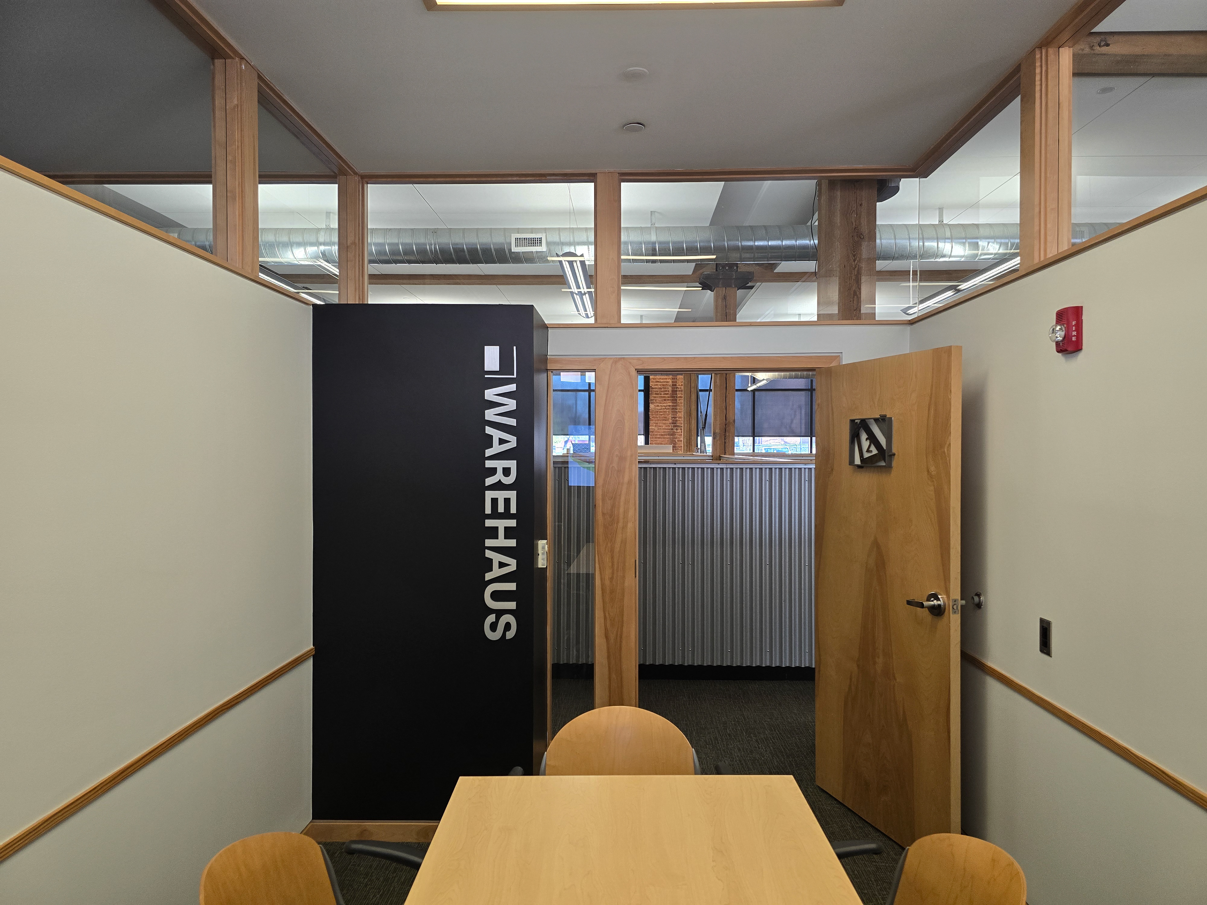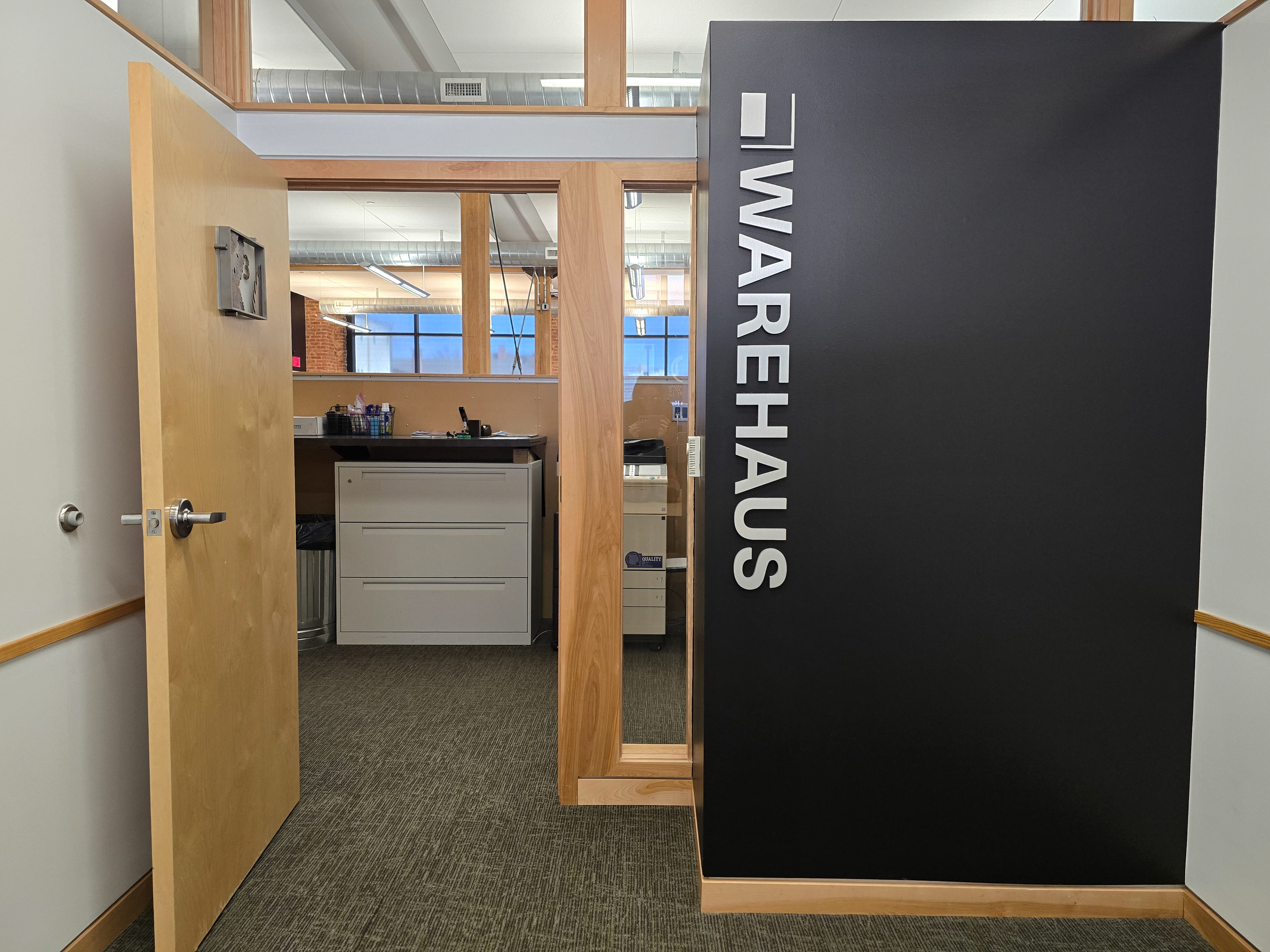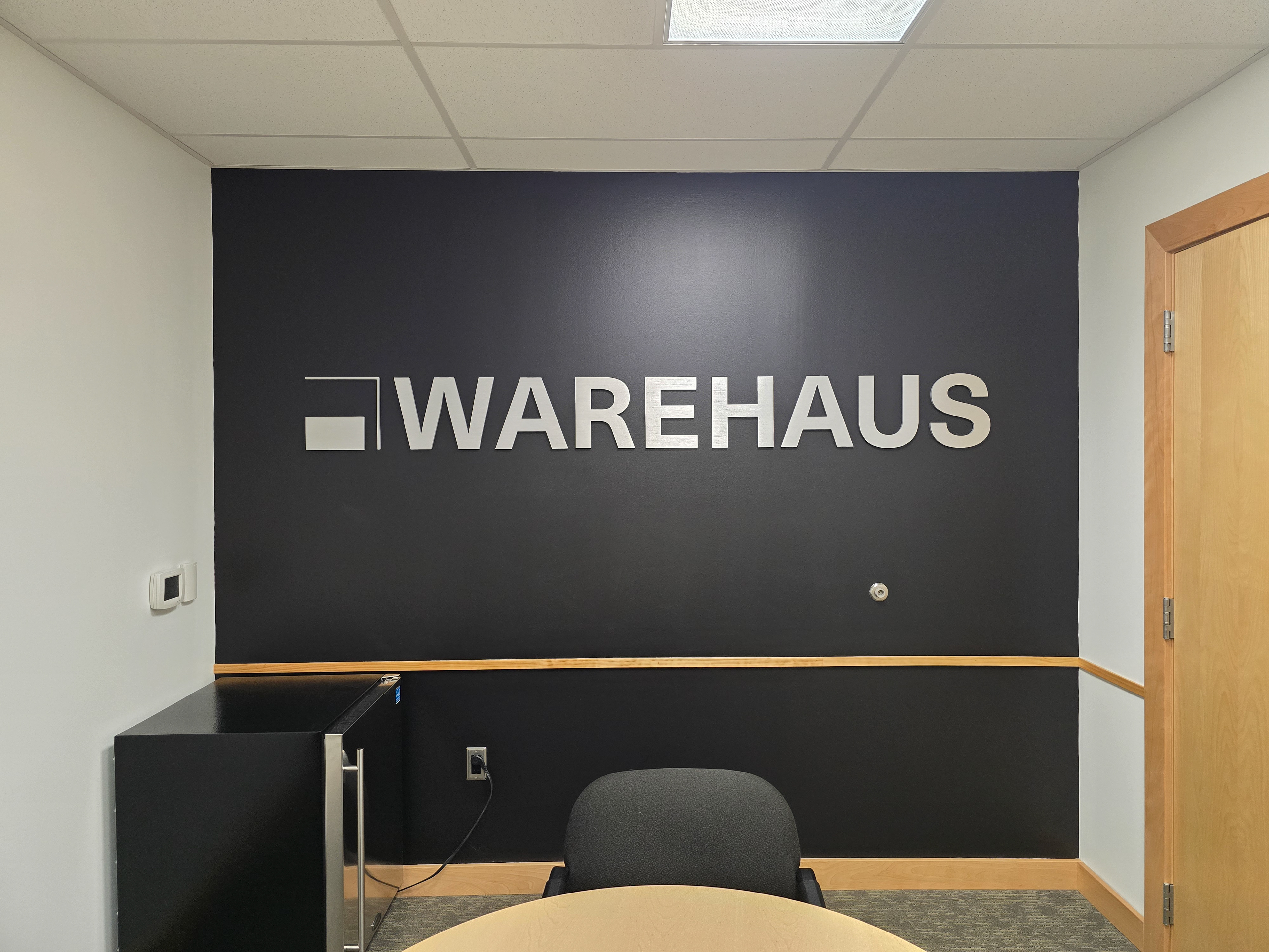 When the owners of Warehaus purchased their building, they wanted to make some branding modifications that would stand out. Since many of our meetings take place virtually, the owners wanted to provide a way to show our branding in the background of each conference space during virtual video meetings. The idea of having the company logo against a bold, branded wall was irresistible.