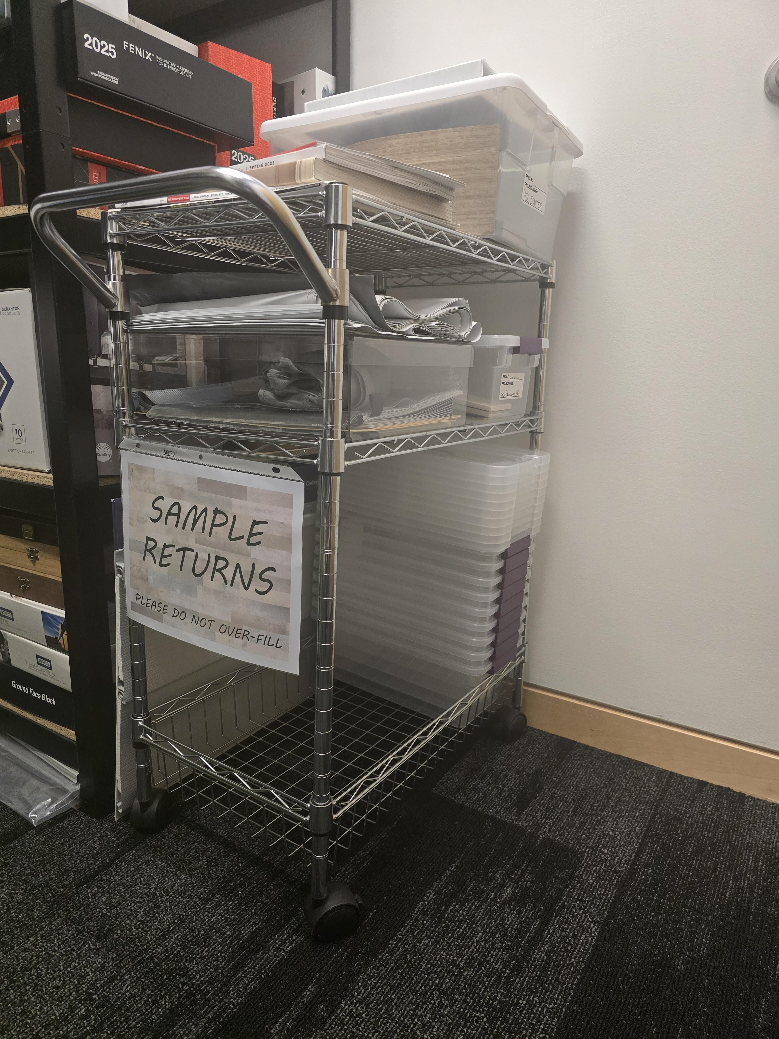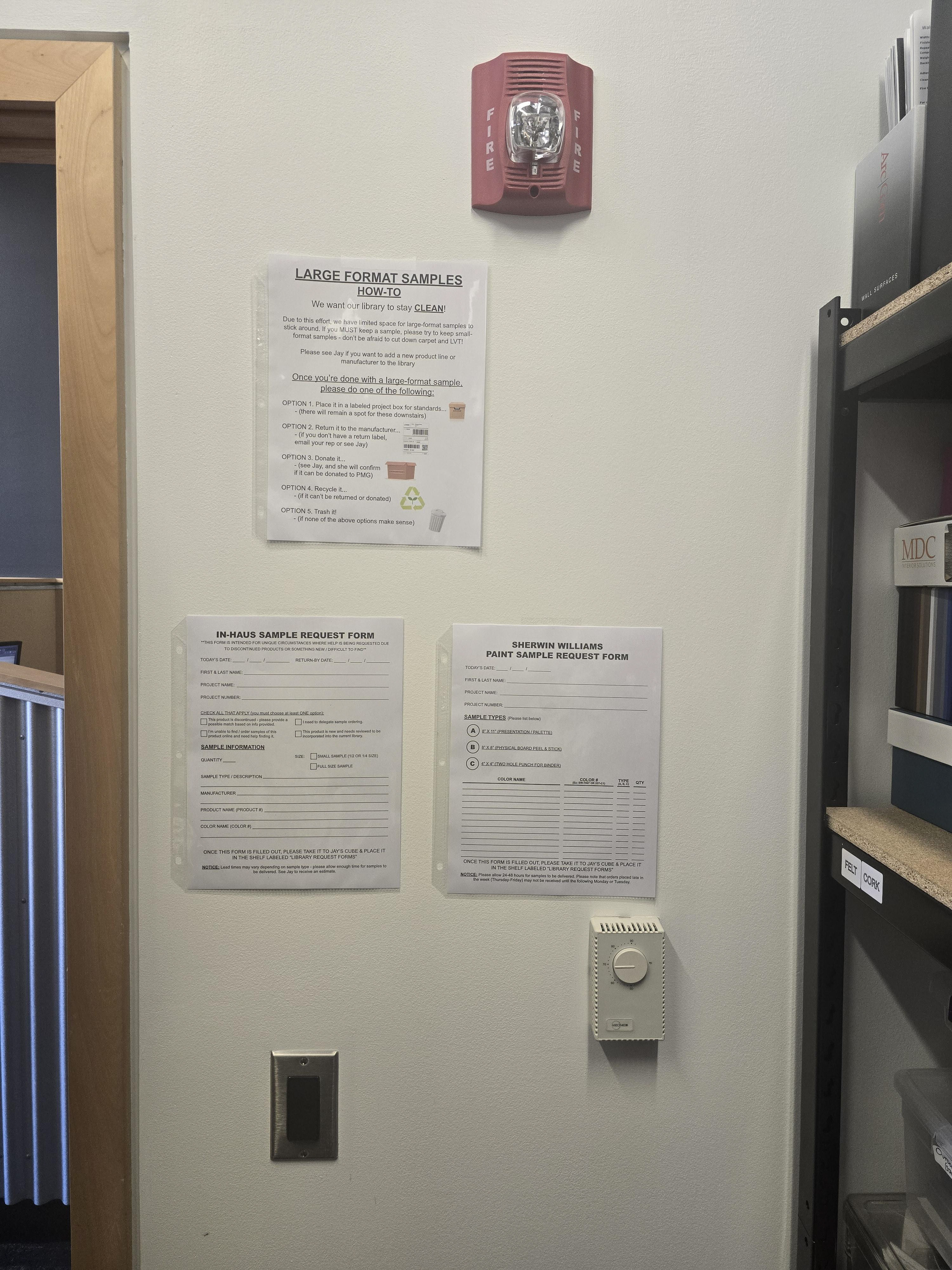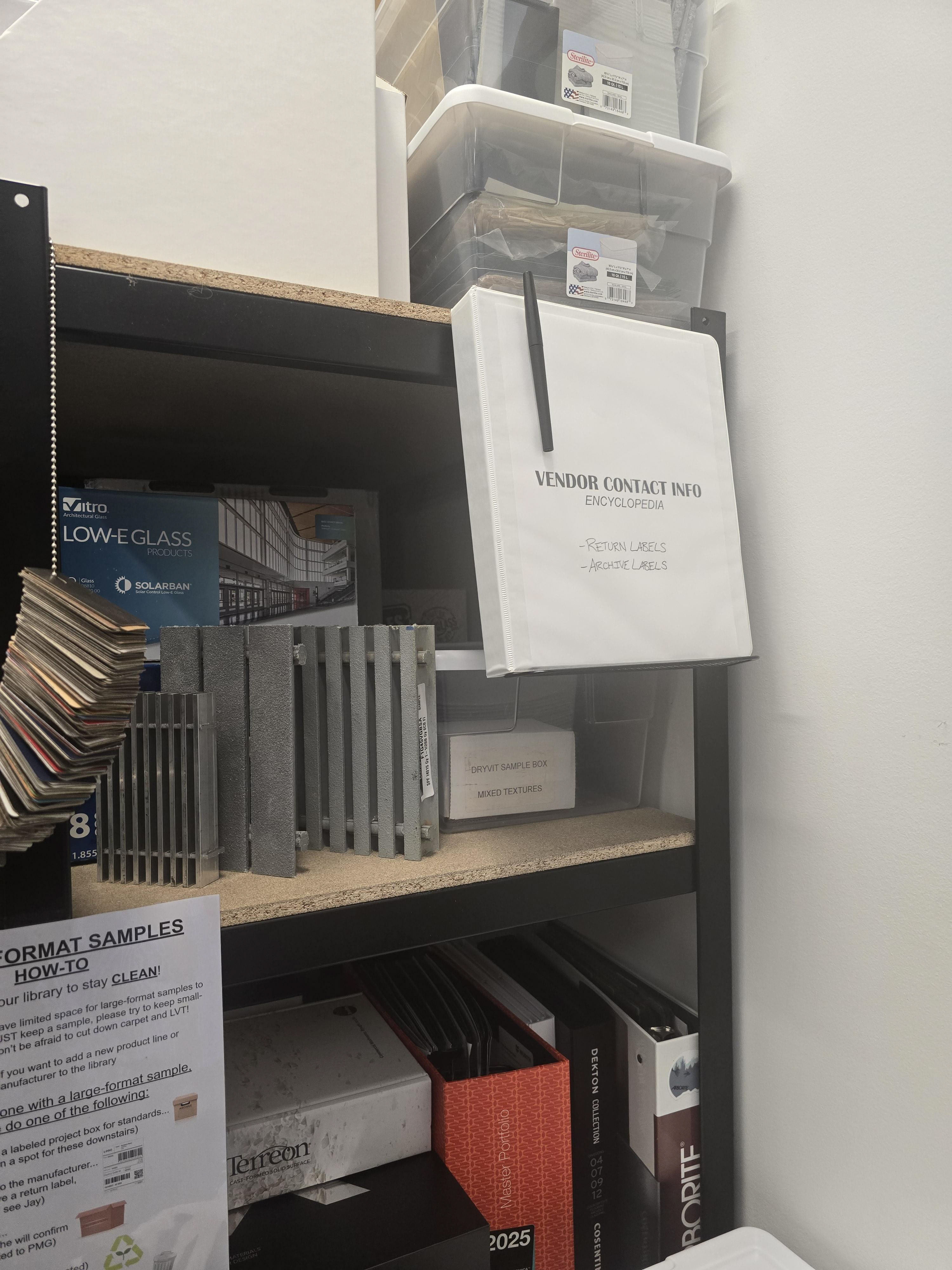 Once the new library was in place, I was able to create an organization system that I trained other employees how to use. I also created forms that colleagues could fill out when they needed assistance with sample ordering or researching a specific material. We even streamlined the process for product representatives to reach out and schedule appointments to visit our library and update their brands through a meeting with me.