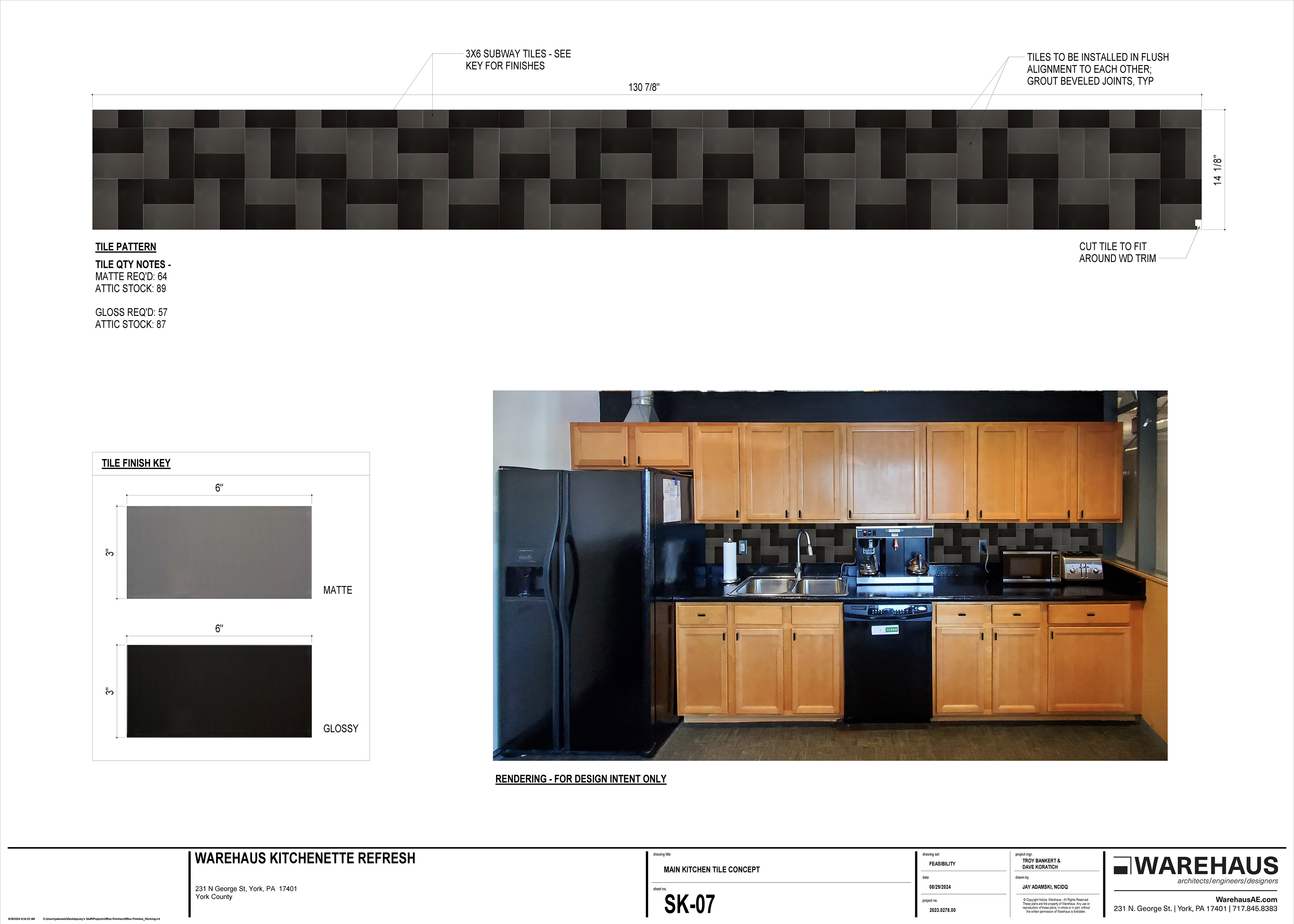 My presentation of the design ideas went over extremely well with the owners, and they loved my tile pattern idea! The owners felt it reflected their brand in a modern and sleek way, and they chose this pattern to be installed additionally in the main kitchen after the kitchenette was completed.