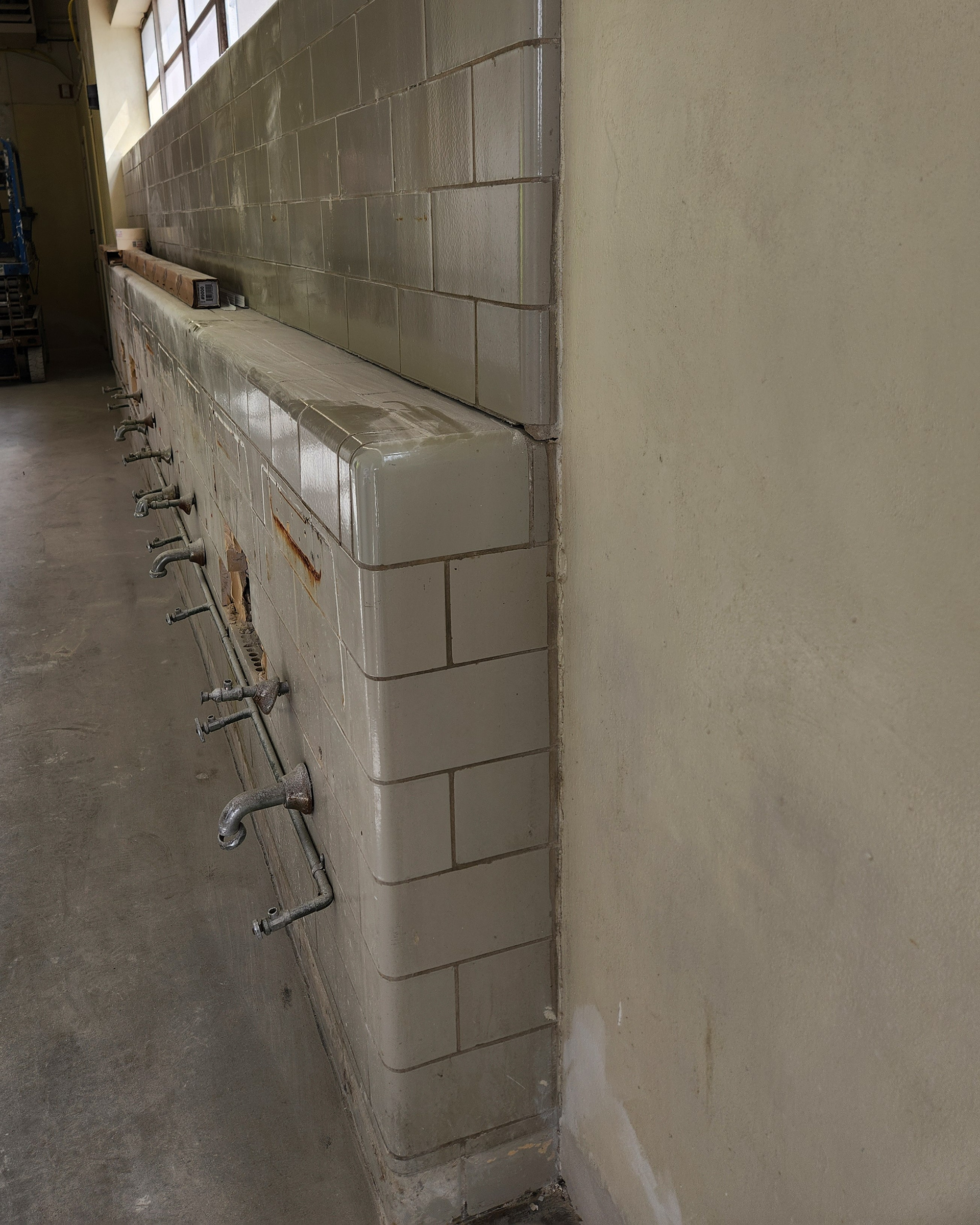 Another challenge we faced was how to cover the walls made of structural glazed tile in the Memorial Hall Restrooms. With every corner rounded, it was going to be a difficult feat to cover these surfaces with a new finish. Working together with the team at Warehaus, we created details for two different solutions that the owner could choose from: FRP or Ceramic Tile. Once we understood the details and estimated cost for each, the owner chose to use ceramic tile, which turned out beautifully!